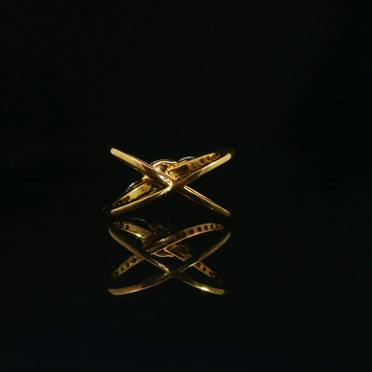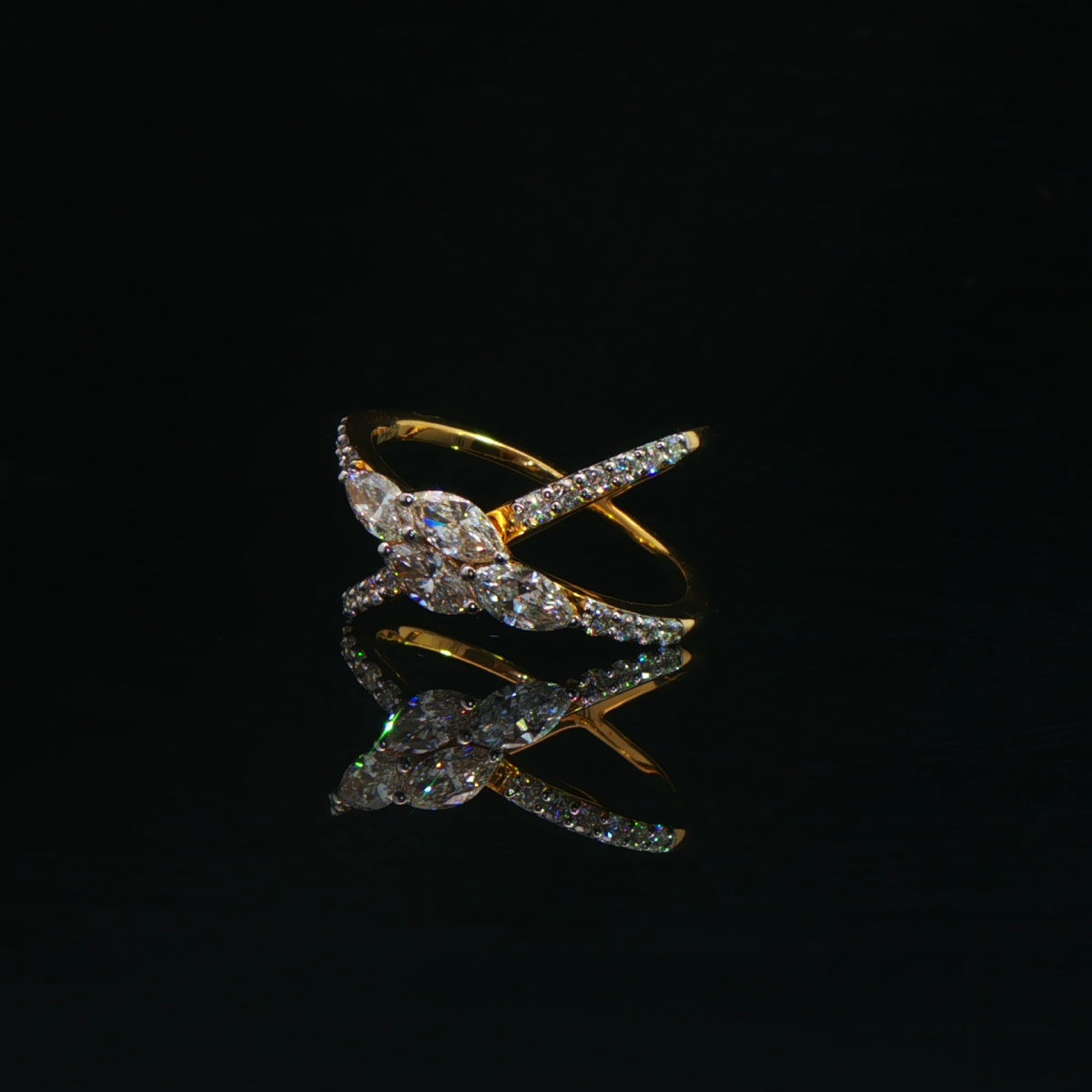 A bold criss-cross ring centered with a sparkling round diamond.