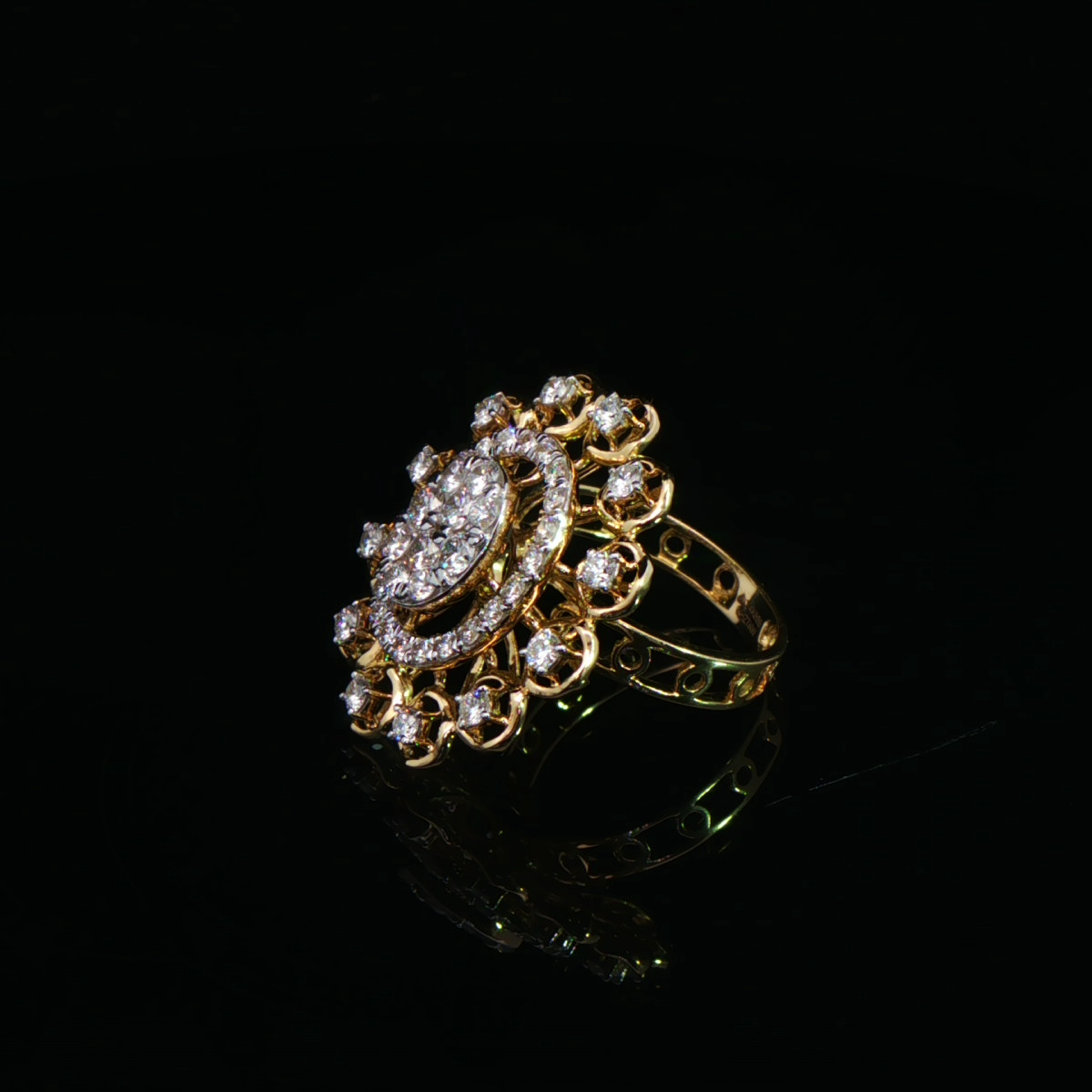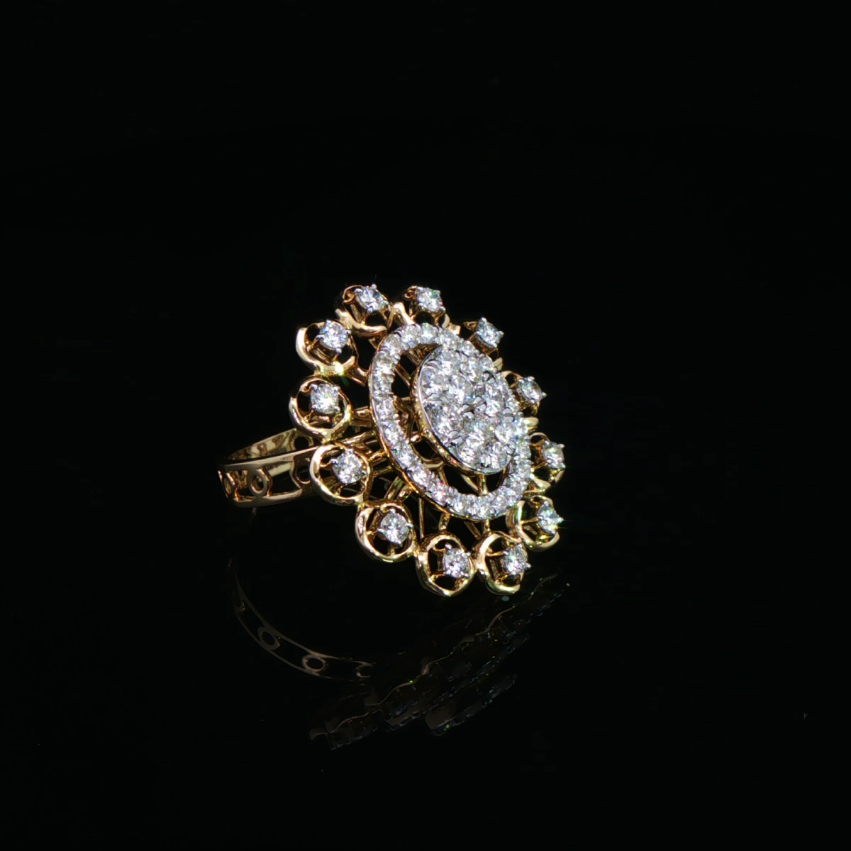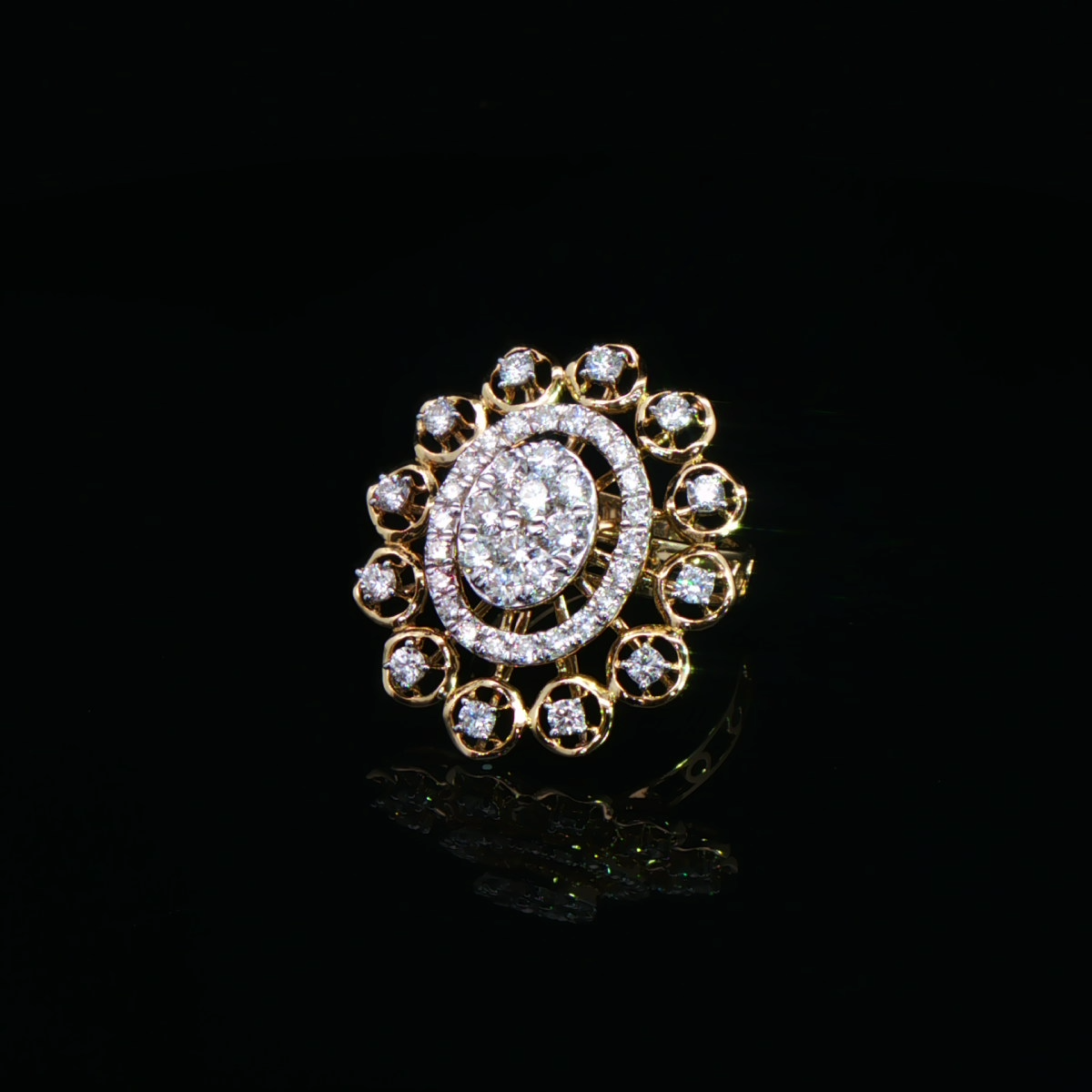 This vintage-inspired diamond cocktail ring for women features an oval cluster centre framed by a double halo and a bold outer ring of bezel-set diamonds in yellow gold.