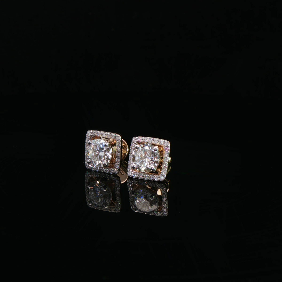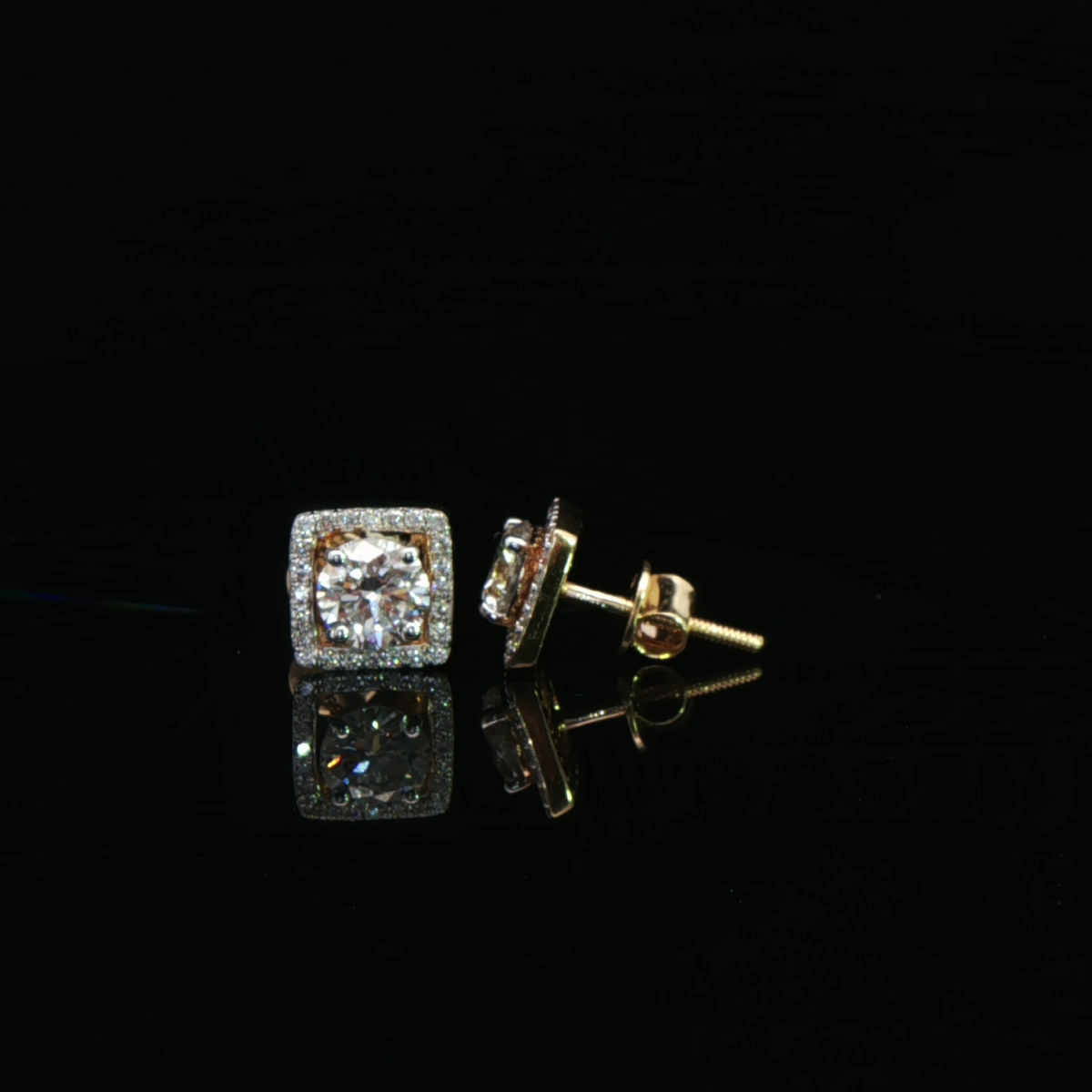 These classic diamond earrings for women feature round solitaire-style centres framed by square pavé-set halos in yellow gold.