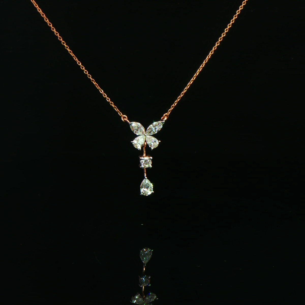 This elegant diamond pendant necklace features a delicate rose gold chain with a floral cluster of marquise stones and a dangling pear-shaped drop.