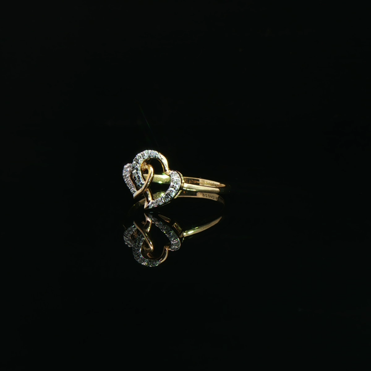 A delicate ring featuring two intertwined heart motifs, gracefully outlined with shimmering diamonds. Crafted in polished yellow gold, this design symbolizes love and connection.