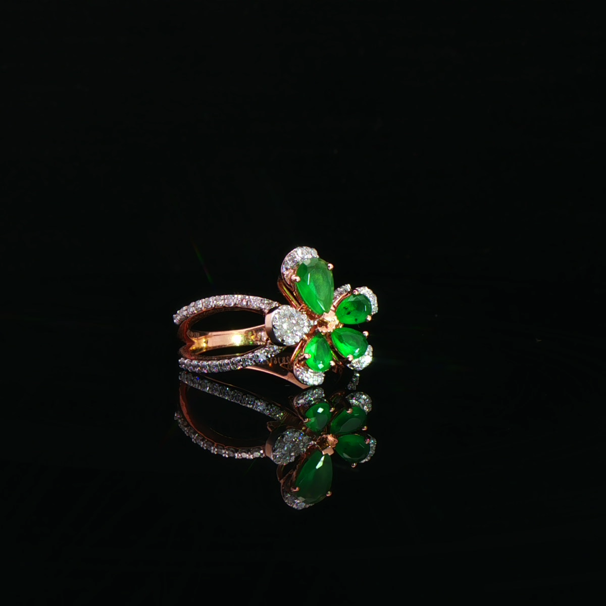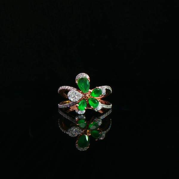 A refined rose gold ring showcasing vivid pear-shaped emeralds arranged in a floral silhouette, accented with brilliant diamonds for a luminous, high-jewellery finish.