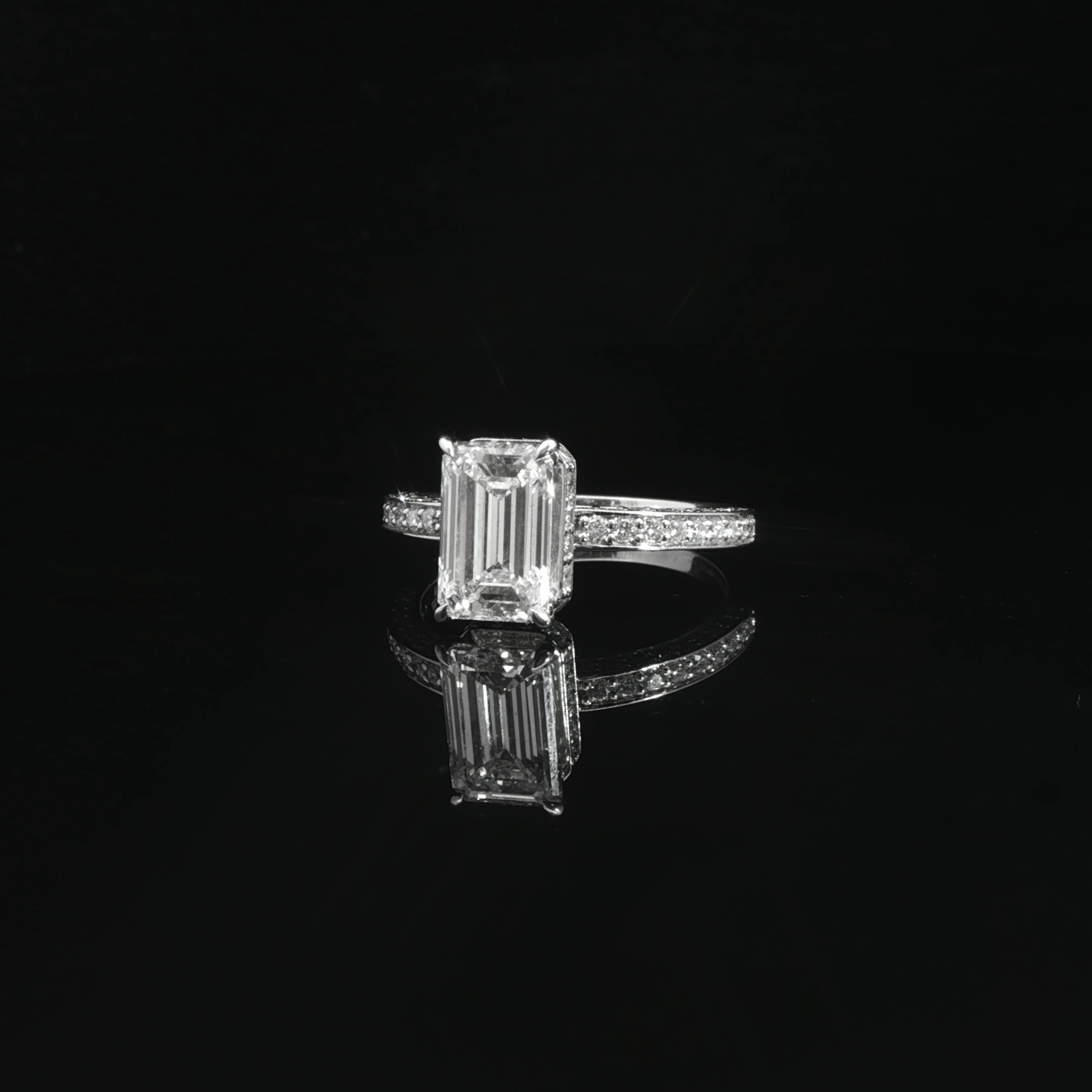 A sleek emerald-cut diamond set on a delicate diamond-accented band for timeless elegance.