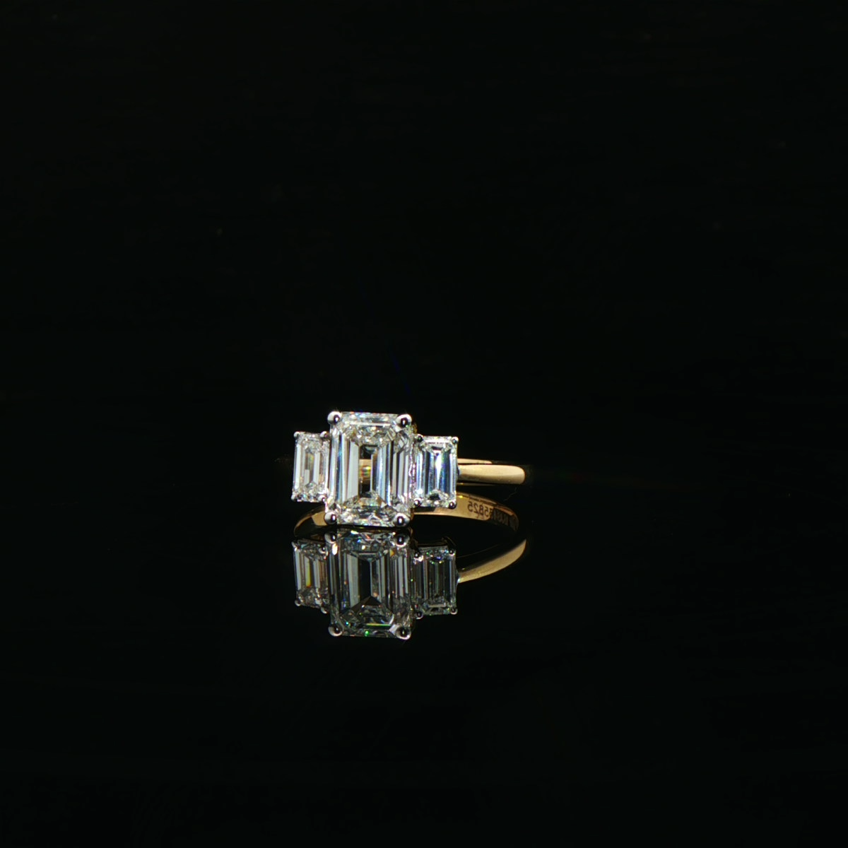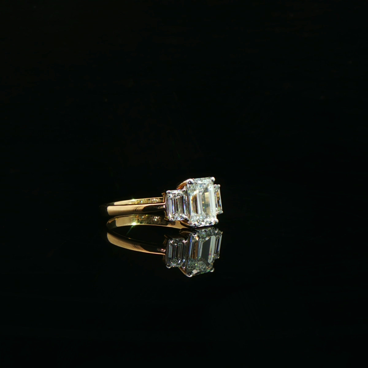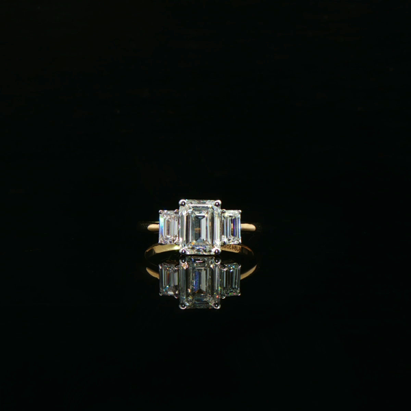 A striking emerald-cut diamond takes center stage, flanked by sleek baguette diamonds that enhance its architectural brilliance. Set in polished yellow gold, this ring embodies modern luxury with timeless sophistication, perfect for elevated everyday wear