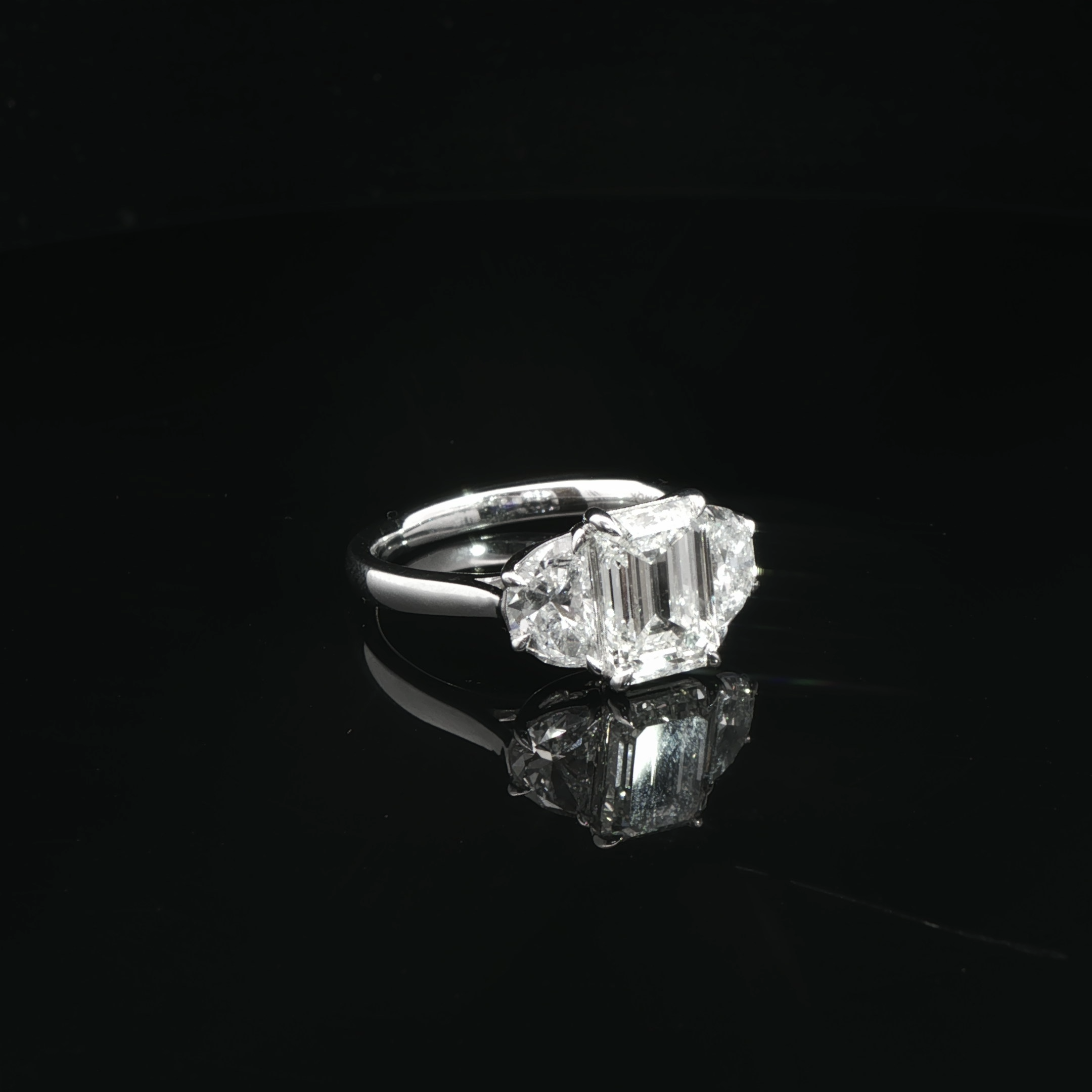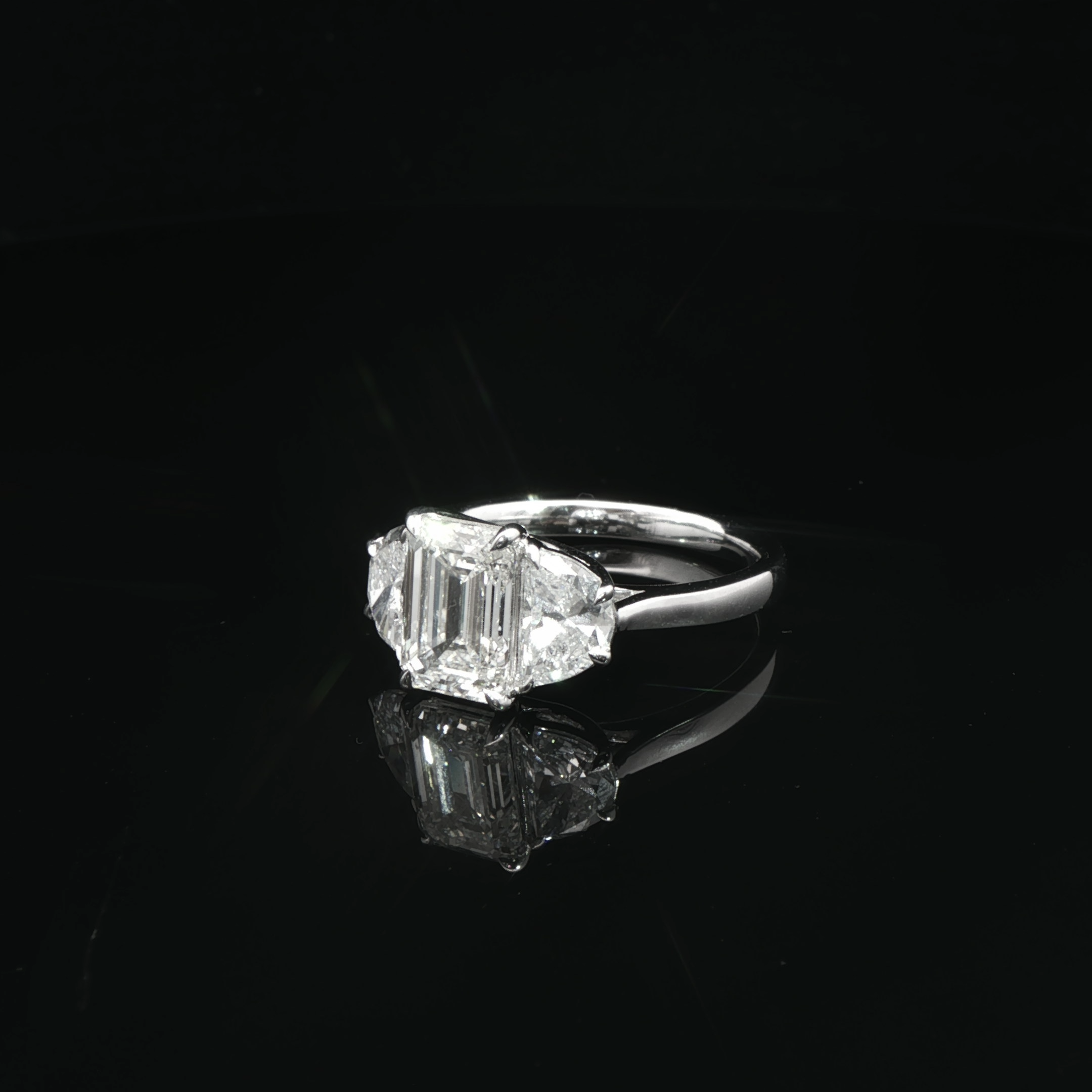 A timeless three-stone ring featuring an emerald-cut center diamond accented by brilliant side stones.