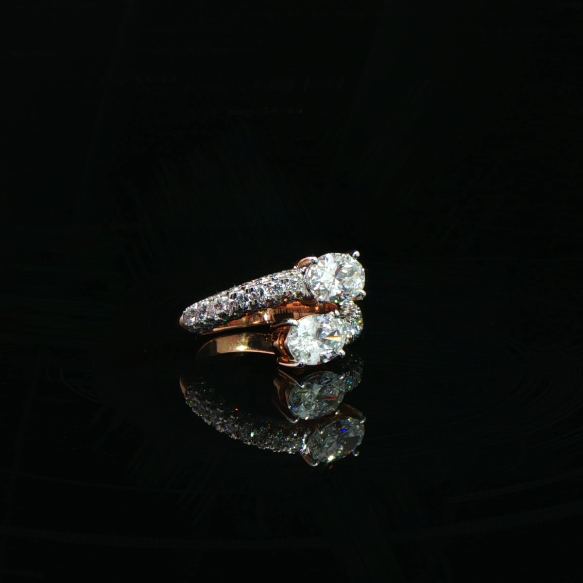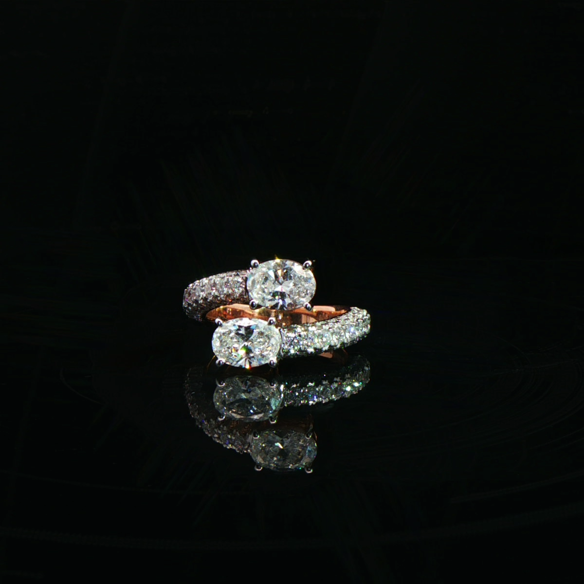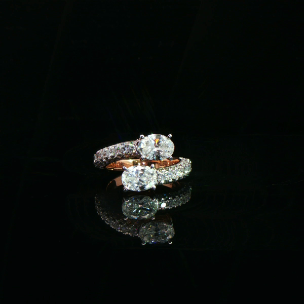 This exquisite duo ring features two radiant oval-cut diamonds set in perfect harmony. Pavé-set diamond bands embrace each centerpiece, creating a seamless flow of brilliance and depth.