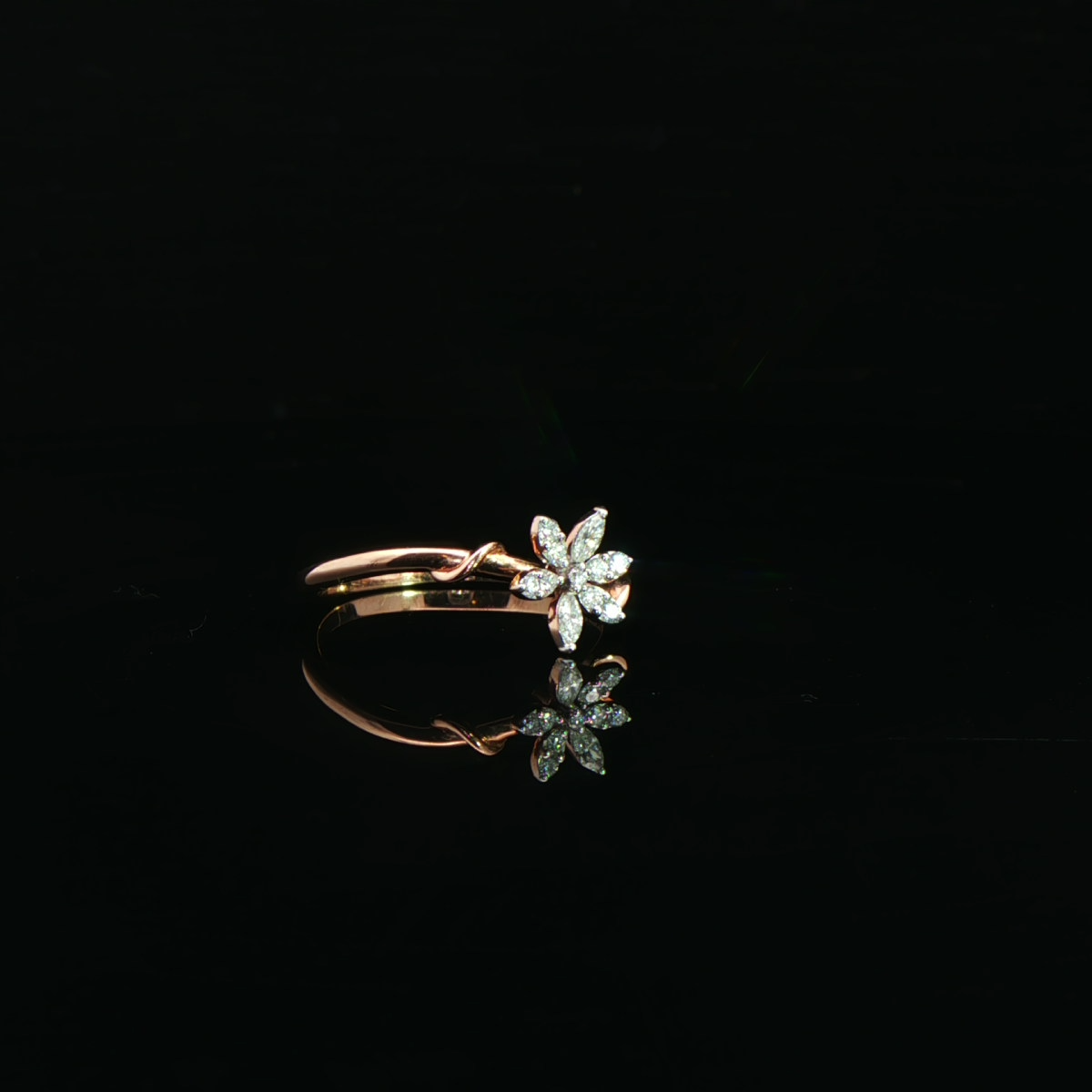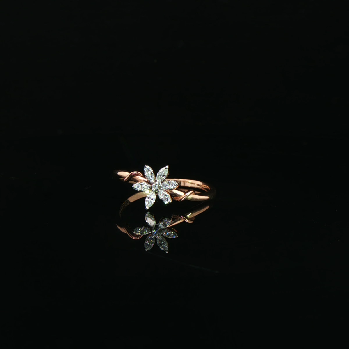 A graceful expression of elegance, this rose gold ring showcases a delicate floral motif adorned with shimmering marquise-cut diamonds, designed to capture light from every angle.