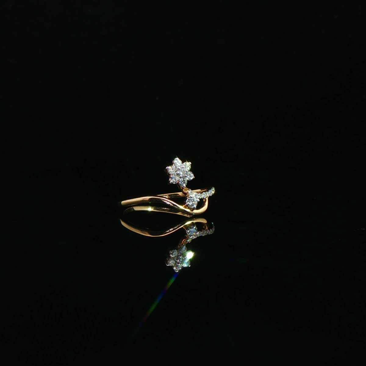 A refined diamond ring showcasing a delicate floral motif paired with a flowing, sculpted gold band. Designed to reflect effortless luxury, this piece brings timeless elegance and modern artistry together in perfect harmony.