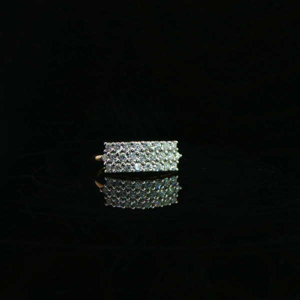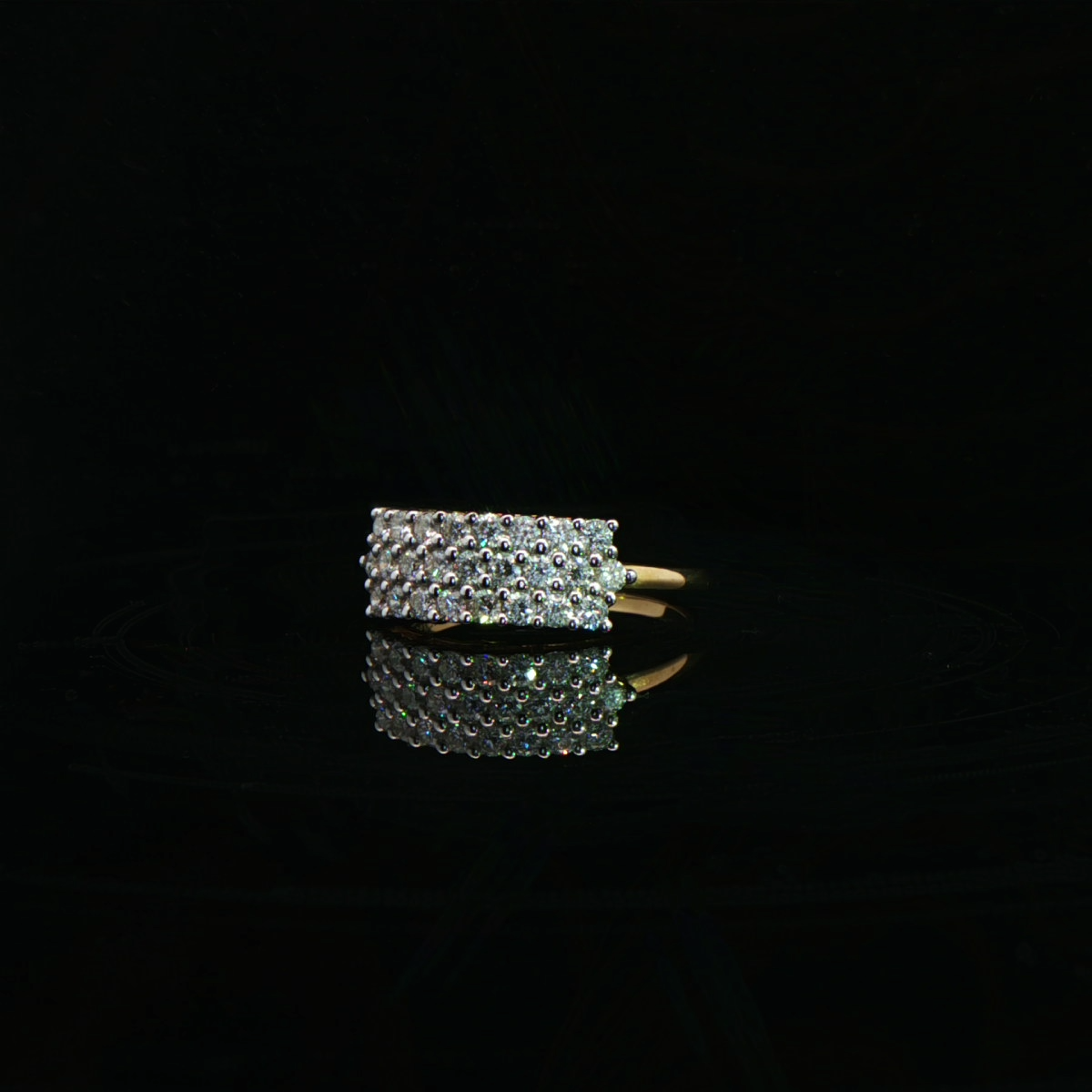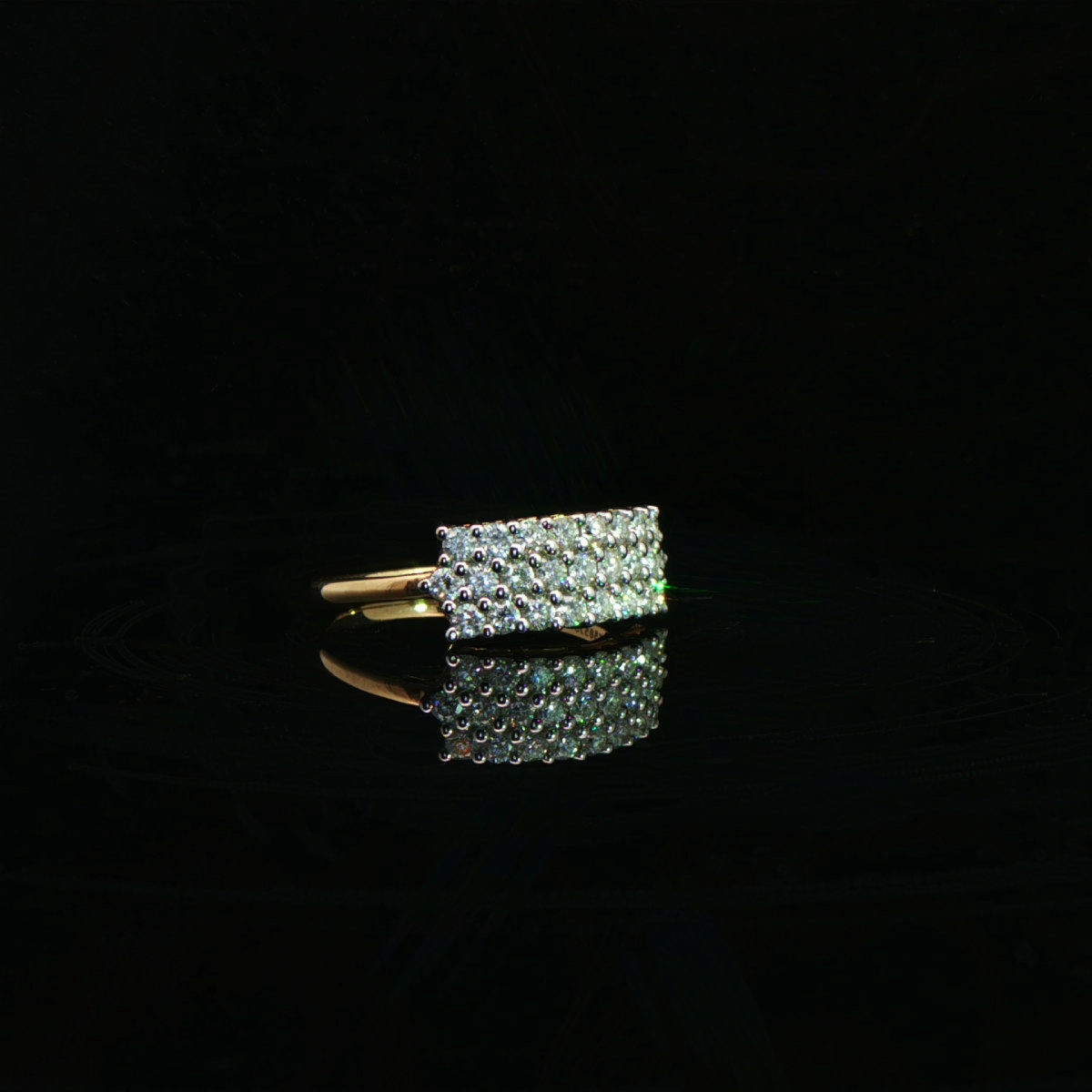 This bold rectangle cluster diamond ring features a wide pavé-set rectangular diamond panel on a slim gold band.