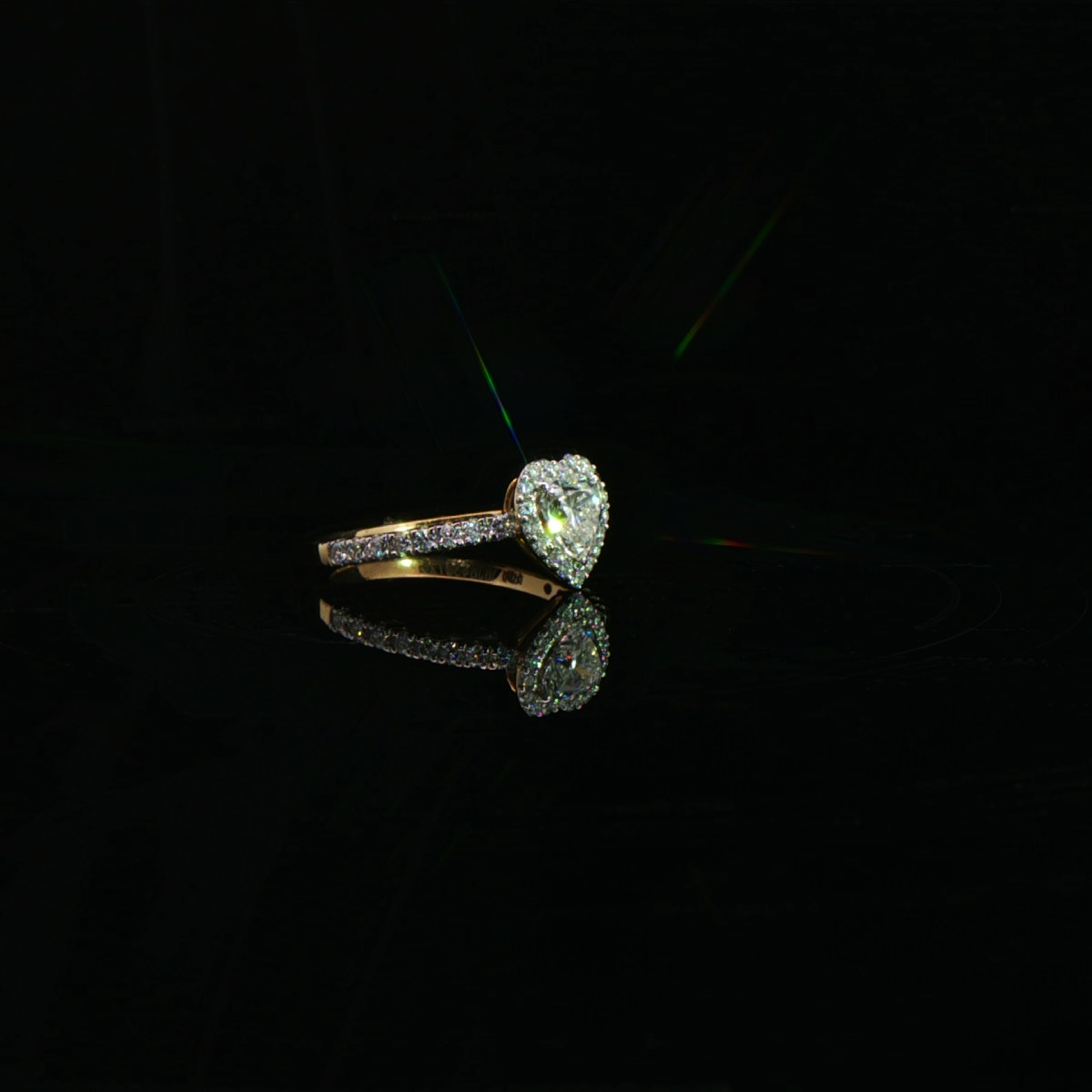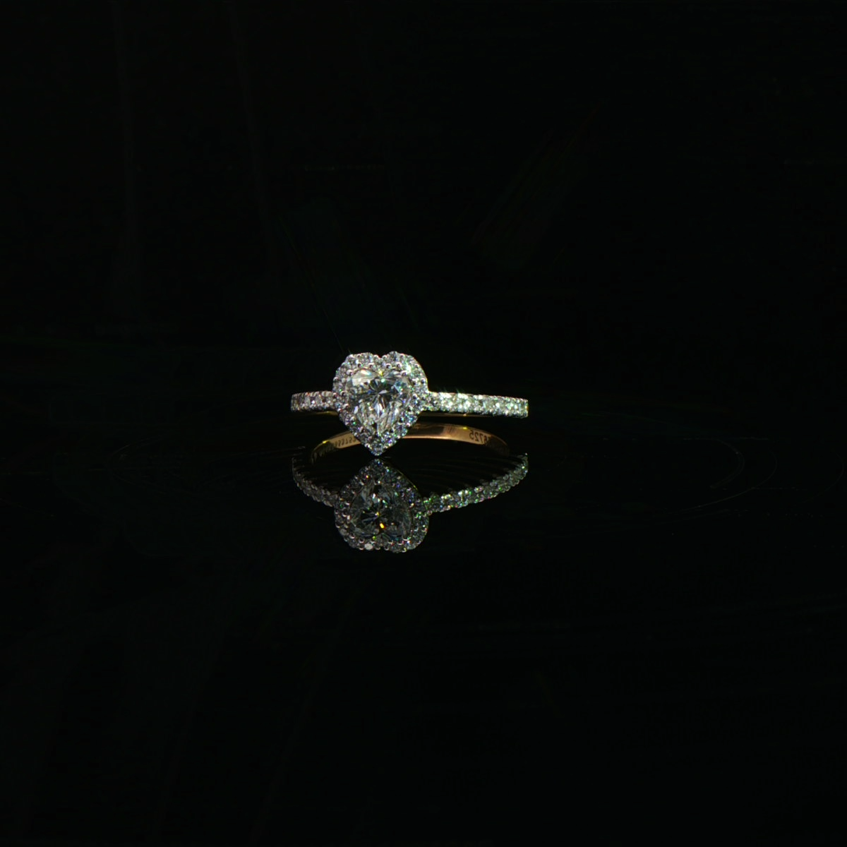 This romantic heart shape diamond ring features a sparkling heart solitaire set on a slim pavé diamond band in gold