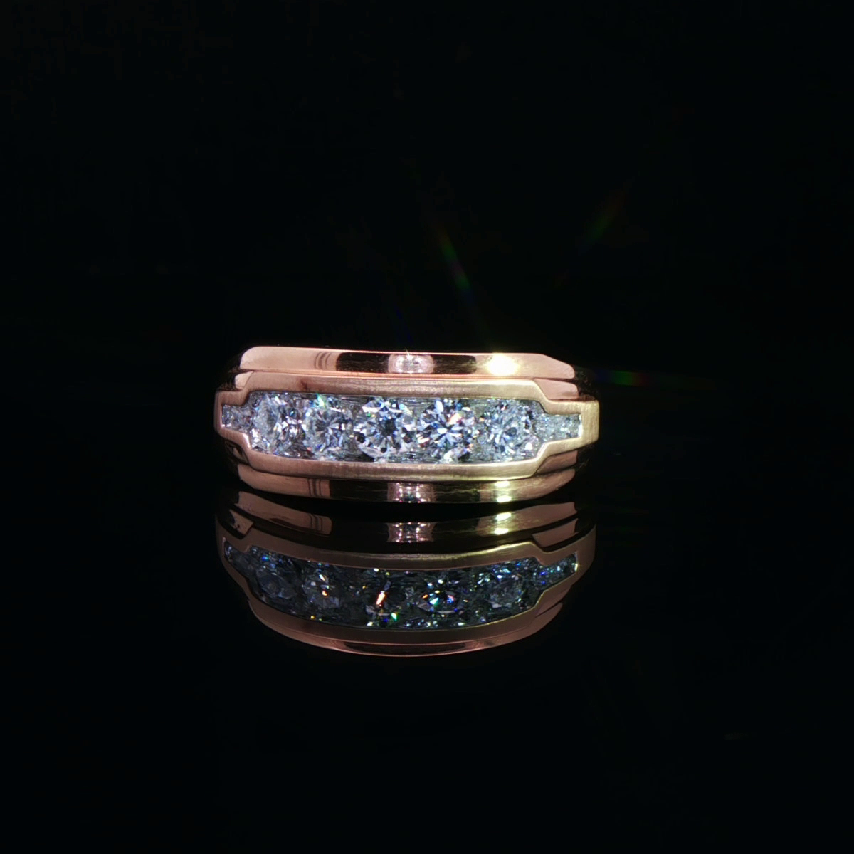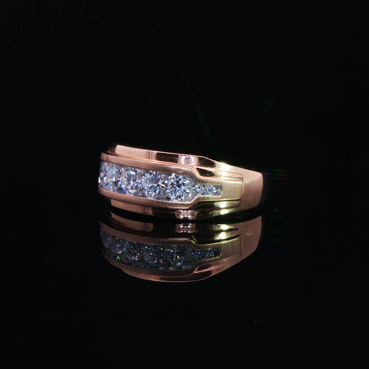 A refined men’s diamond band crafted in warm rose gold, featuring a sleek channel of brilliant diamonds for a powerful yet elegant statement.
