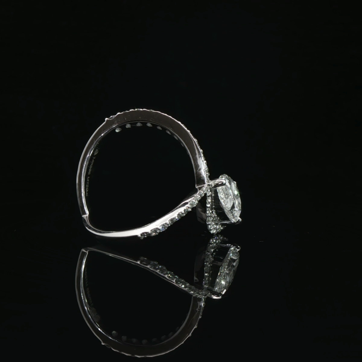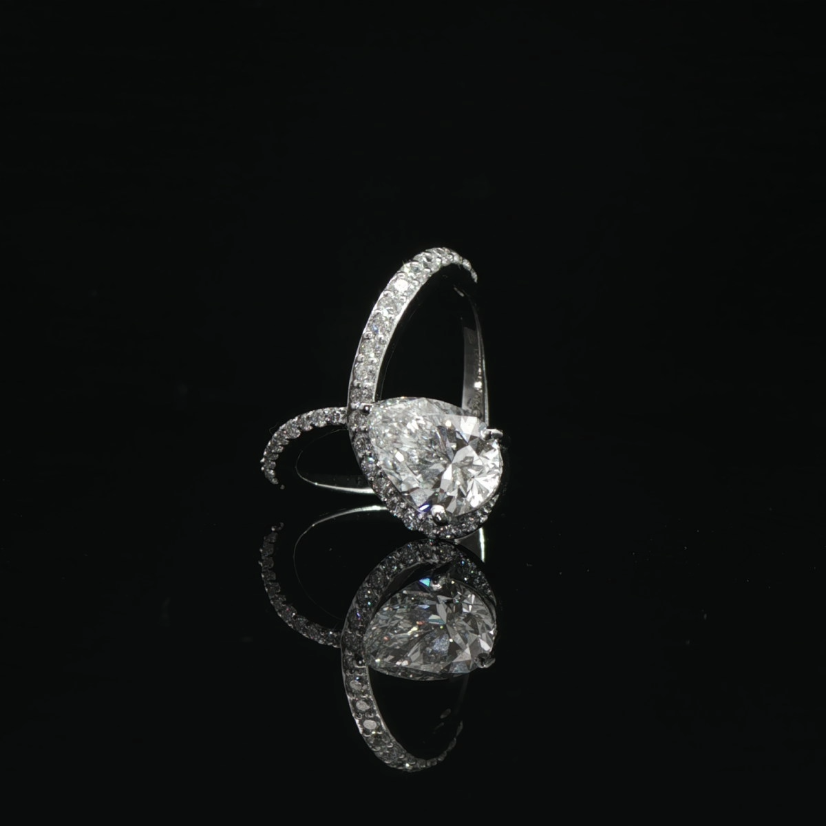 An elegant crossover ring highlighting a brilliant pear-cut diamond.