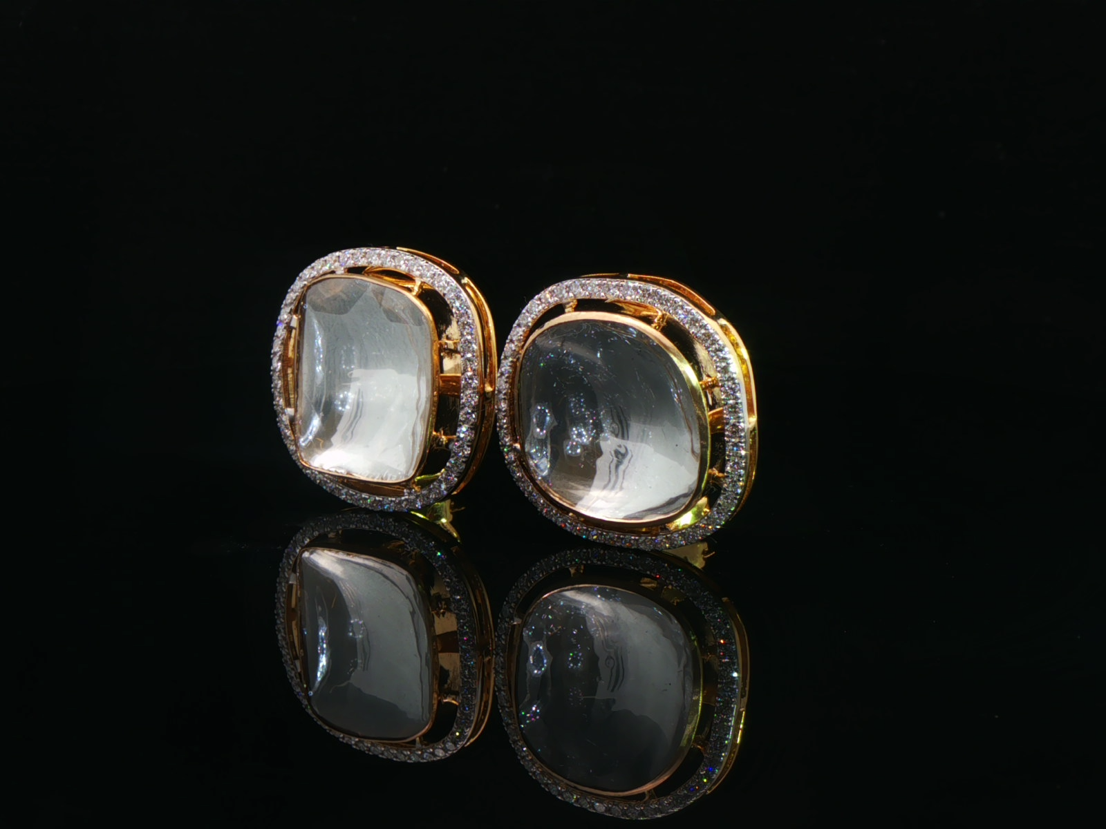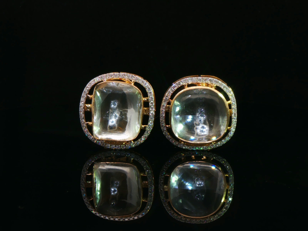 These regal polki earrings for women feature cushion-shaped uncut polki stones framed by a delicate diamond-style halo in yellow gold.
