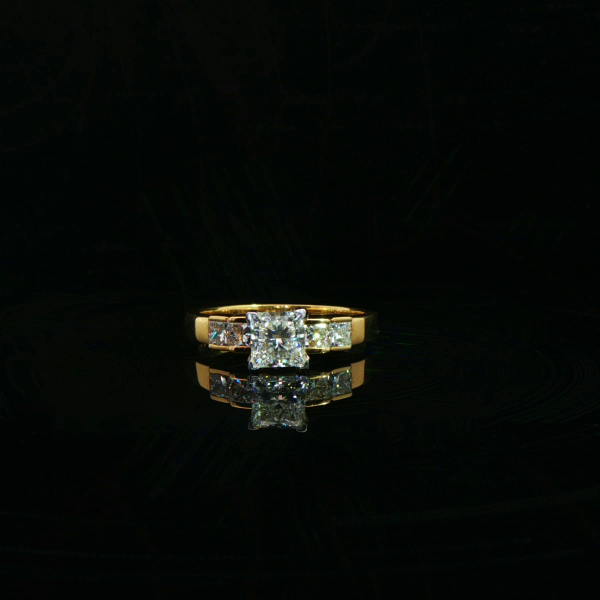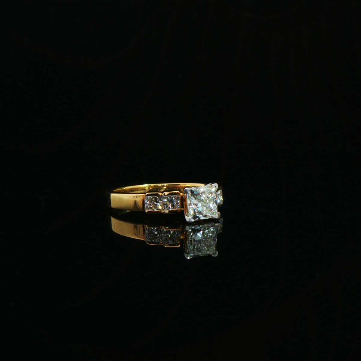 A striking princess-cut diamond takes center stage, flanked by precisely set side diamonds that enhance its brilliance. Crafted in a polished gold band, this ring reflects timeless luxury with a modern edge perfect for moments that deserve to shine.