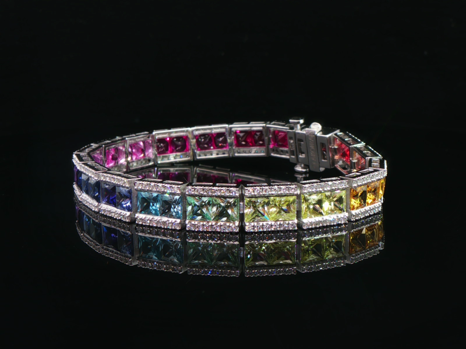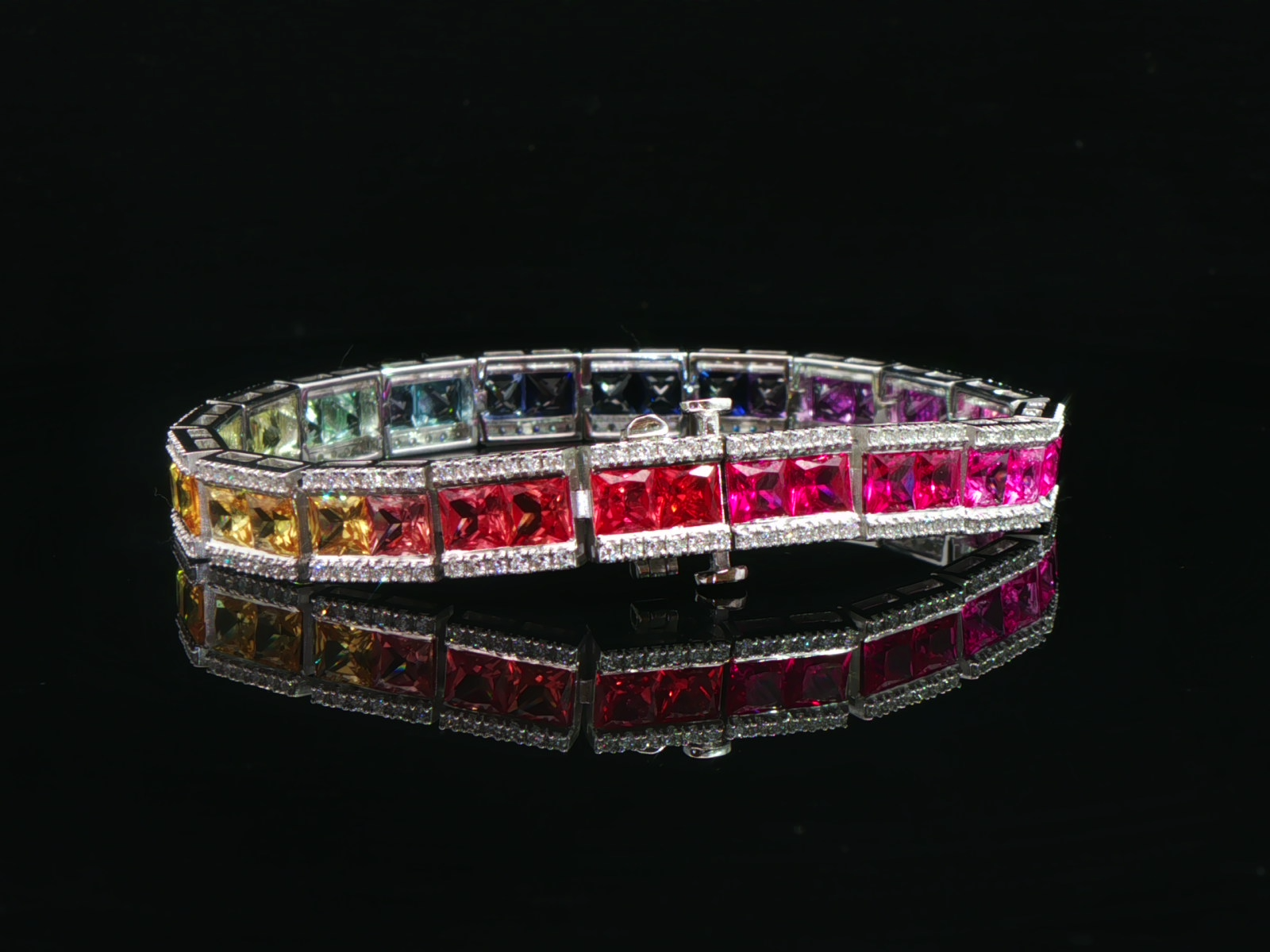 This luxurious rainbow sapphire bracelet features a full spectrum of princess-cut coloured stones framed with sparkling diamond accents in a white gold look.
