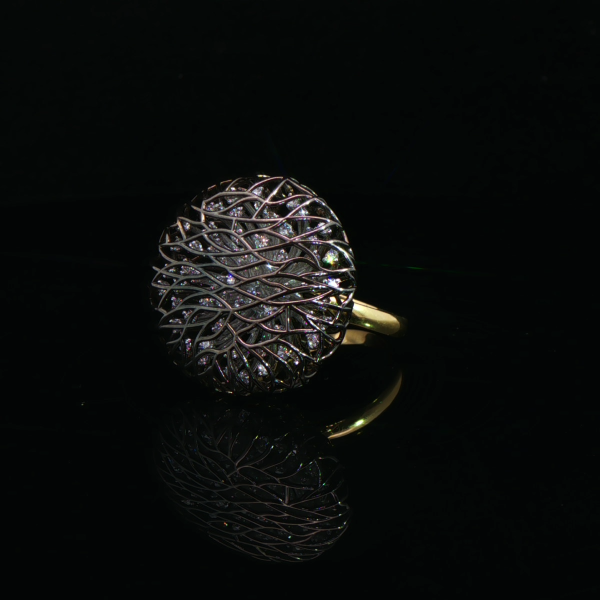 This bold diamond ring for women features a large round top with an intricate criss-cross pattern of shimmering stones, perfect as a cocktail women’s diamond ring for parties.